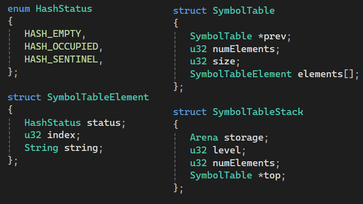 All the structs used to store the stack-of-hashmaps data structure. All of the SymbolTables and corresponding Elements are stored in the “storage” Arena