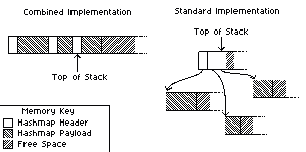 Comparison of the memory layout of the combined stack-of-hashmaps versus the separated stack of hashmaps